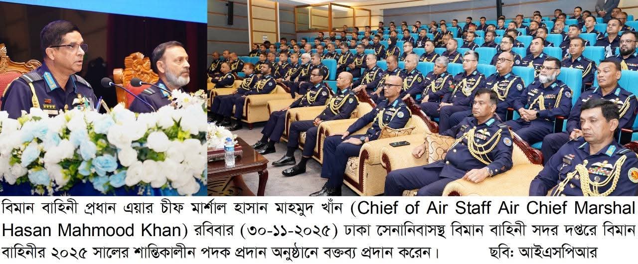 ঢাকা, ৩০ নভেম্বর ২০২৫: বাংলাদেশ বিমান বাহিনীর কর্মকর্তা ও বিমানসেনাগণের মাঝে শান্তিকালীন পদক প্রদান অনুষ্ঠান রবিবার (৩০-১১-২০২৫) বাংলাদেশ বিমান বাহিনী সদর দপ্তরে অনুষ্ঠিত হয়। উক্ত অনুষ্ঠানে সম্মানিত বিমান বাহিনী প্রধান এয়ার চীফ মার্শাল হাসান মাহমুদ খাঁন, বিবিপি, ওএসপি, জিইউপি, এনএসডব্লিউসি, পিএসসি প্রধান অতিথি হিসেবে উপস্থিত থেকে শান্তিকালীন পদক প্রদান করেন।