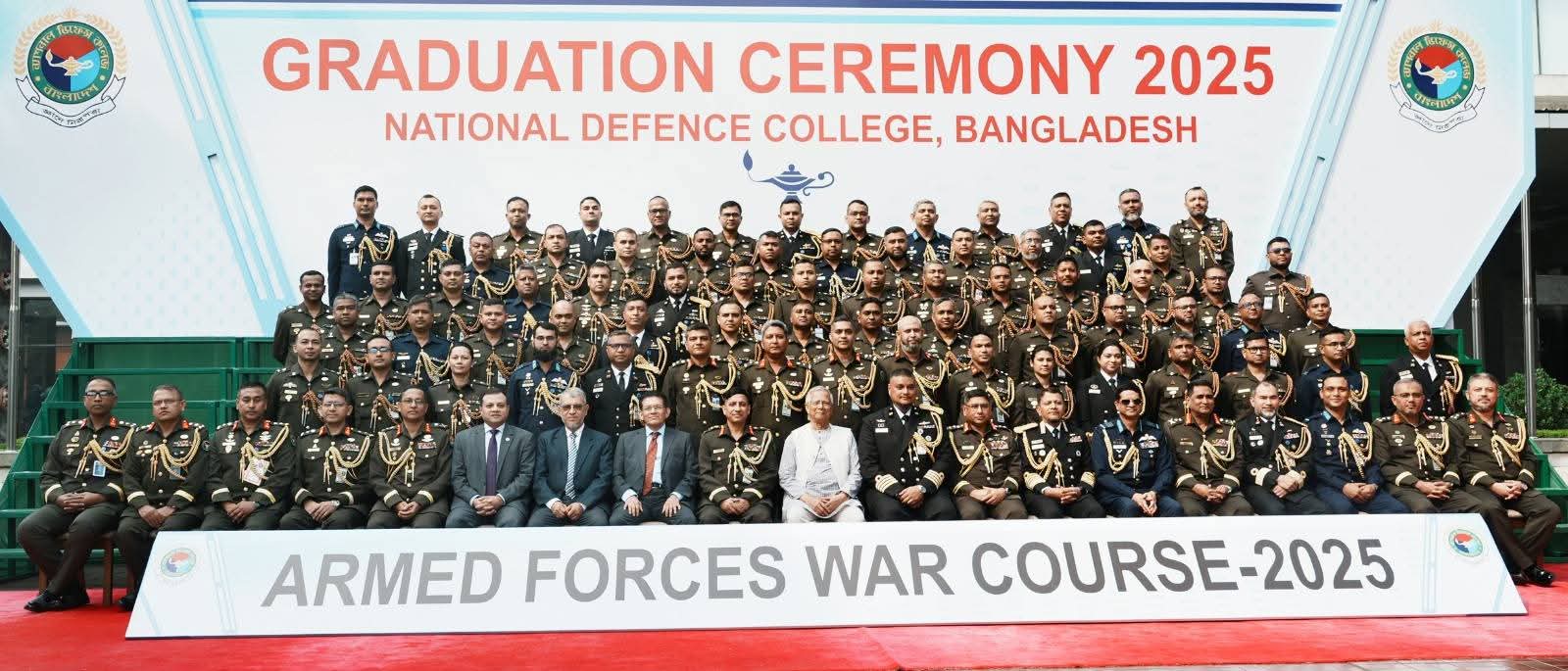 উল্লেখ্য, এ বছর ন্যাশনাল ডিফেন্স কোর্স ২০২৫ -এ মোট ৯৬ জন কোর্স সদস্য অংশগ্রহন করেন। যার মধ্যে বাংলাদেশ সশস্ত্র বাহিনীর ৪৯ জন, অসামরিক প্রশাসনের ১৮ জন এবং ভ্রাতৃপ্রতিম ১৮টি দেশের ২৯ জন সদস্য অন্তর্ভুক্ত ছিলেন। পাশাপাশি বাংলাদেশ সেনা, নৌ ও বিমান বাহিনীর ৫৬ জন কর্মকর্তা সফলভাবে আর্মড ফোর্সেস ওয়ার কোর্স ২০২৫ সম্পন্ন করেন।