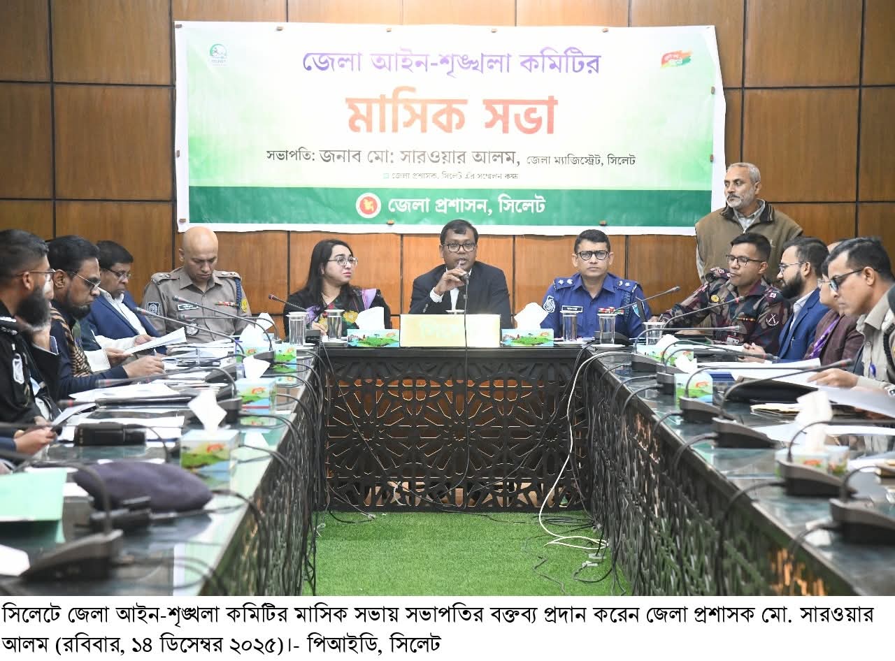 সিলেটে জেলা আইনশৃঙ্খলা কমিটির সভা রবিবার (১৪ ডিসেম্বর) জেলা প্রশাসক কার্যালয়ে অনুষ্ঠিত হয়েছে। জেলা প্রশাসক ও জেলা ম্যাজিস্ট্রেট মোঃ সারওয়ার আলম সভায় সভাপতিত্ব করেন।