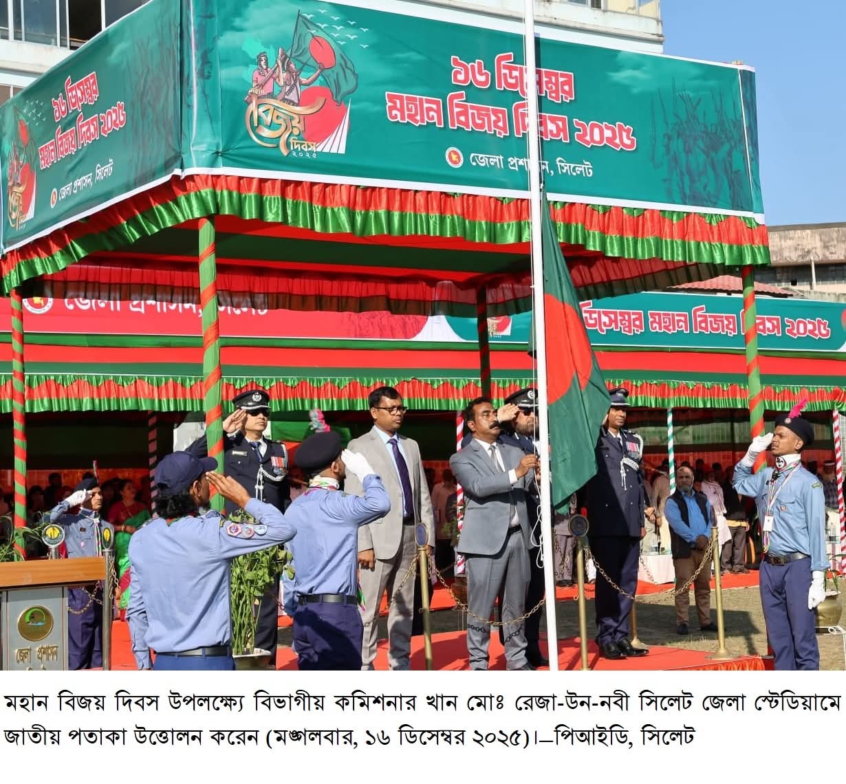 মঙ্গলবার ০১ পৌষ (১৬ ডিসেম্বর): সিলেটে যথাযোগ্য মর্যাদায় মহান বিজয় দিবস উদ্যাপন উপলক্ষ্যে সূর্যোদয়ের সাথে সাথে জেলা প্রশাসক কার্যালয় প্রাঙ্গণে ৩১ বার তোপধ্বনি, কেন্দ্রীয় শহিদ মিনারে পুষ্পস্তবক অর্পণ ও সিলেট জেলা স্টেডিয়ামে জাতীয় পতাকা উত্তোলন, জাতীয় সংগীত পরিবেশন এবং বিভিন্ন বাহিনী ও স্কুল কলেজের শিক্ষার্থীদের অংশগ্রহণে কুচকাওয়াজ ও দেশাত্ববোধক ডিসপ্লে প্রদর্শন করা হয়৷ সিলেট জেলা প্রশাসক মোঃ সারওয়ার আলমের সভাপতিত্বে কুচকাওয়াজ ও ডিসপ্লে প্রদর্শন অনুষ্ঠানে প্রধান অতিথি হিসেবে উপস্থিত ছিলেন বিভাগীয় কমিশনার খান মোঃ রেজা-উন-নবী।