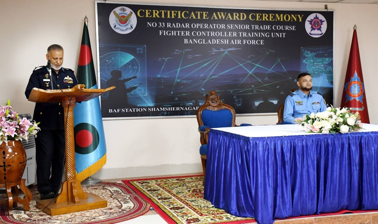 বাংলাদেশ বিমান বাহিনীর ফাইটার কন্ট্রোলার ট্রেনিং ইউনিট এর র্যাডার অপারেটর সিনিয়র ট্রেড কোর্স (এসটিসি-৩৩) এর সমাপনী ও সনদপত্র বিতরণ অনুষ্ঠান গত ১৭ ডিসেম্বর ২৫ তারিখে ফাইটার কন্ট্রোলার ট্রেনিং ইউনিট-এ অনুষ্ঠিত হয়। বাবিবা স্টেশন শমশেরনগর এর স্টেশন কমান্ডার এয়ার কমডোর মো: আব্বাস আলী, জিইউপি, বিইউপি, এনএসডব্লিউসি, এএফডব্লিউসি, পিএসসি উক্ত অনুষ্ঠানে প্রধান অতিথি হিসেবে উপস্থিত থেকে প্রশিক্ষণার্থীদের মাঝে সনদপত্র বিতরণ করেন। উক্ত কোর্সে বাংলাদেশ বিমান বাহিনীর সার্জেন্ট পদবির প্রশিক্ষণার্থীগণ অংশগ্রহণ করেন। প্রধান অতিথি অংশগ্রহণকারী প্রশিক্ষণার্থীদের সফলতার সাথে প্রশিক্ষণ সমাপ্তির জন্য অভিনন্দন জানান এবং প্রশিক্ষণলব্ধ জ্ঞান পেশাগত জীবনে প্রয়োগের আহ্বান জানান।