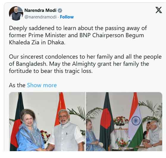 এক্স পোস্টে নরেন্দ্র মোদি লেখেন, ‘বাংলাদেশের সাবেক প্রধানমন্ত্রী ও বিএনপি চেয়ারপারসন খালেদা জিয়ার মৃত্যুতে গভীর শোক প্রকাশ করছি। তার পরিবার এবং বাংলাদেশের সকল মানুষের প্রতি আমাদের আন্তরিক সমবেদনা। সর্বশক্তিমান তার পরিবারকে এই ক্ষতি সহ্য করার শক্তি দান করুন।’