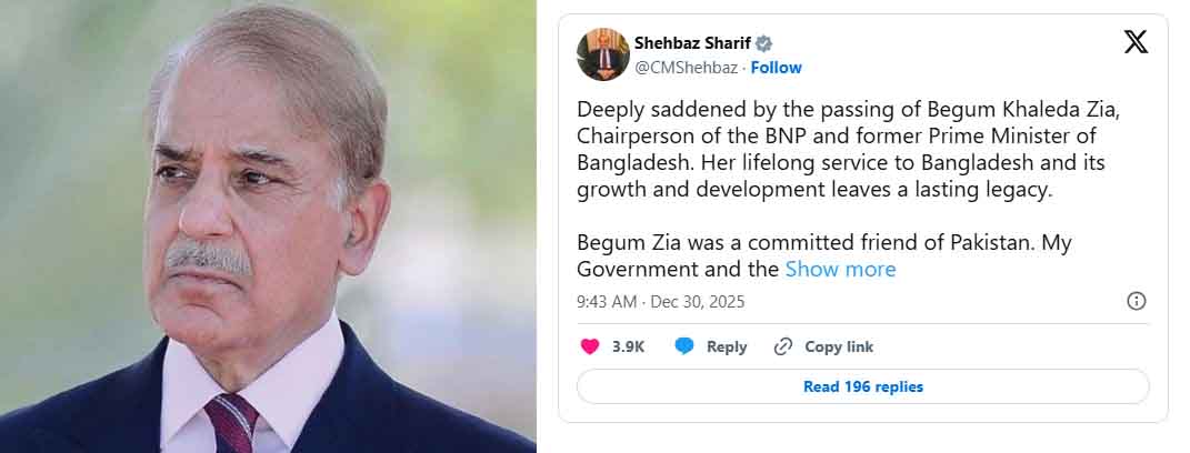 বাংলাদেশের সাবেক প্রধানমন্ত্রী ও বিএনপি চেয়ারপারসন খালেদা জিয়ার মত্যুতে শোক জানিয়েছেন পাকিস্তানের প্রধানমন্ত্রী শাহবাজ শরিফ।