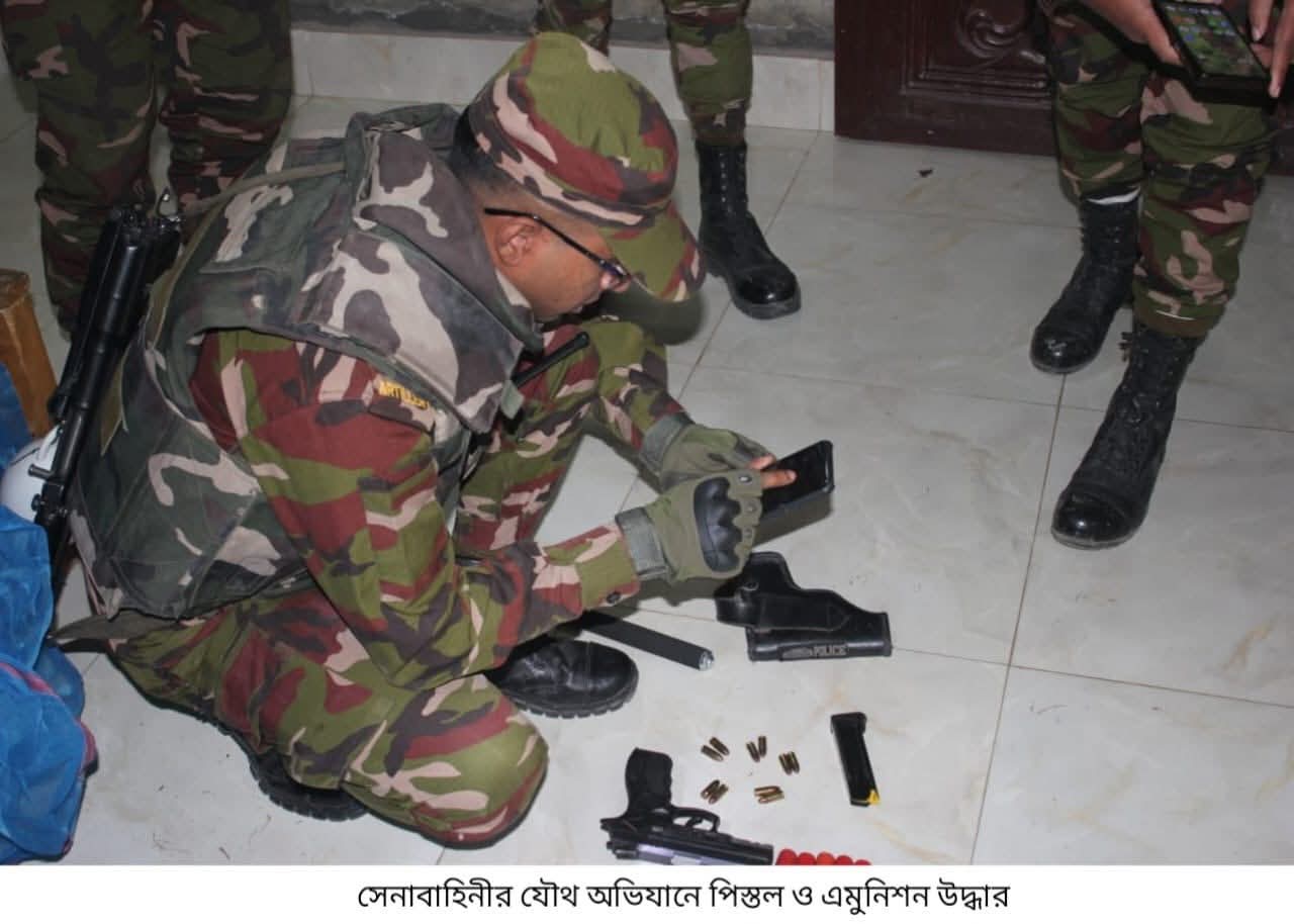 ঢাকা, ০৯ জানুয়ারি ২০২৬ (শুক্রবার): আজ সকালে সুনির্দিষ্ট গোয়েন্দা তথ্যের ভিত্তিতে বাংলাদেশ সেনাবাহিনীর একটি যৌথ অভিযান দল নারায়ণগঞ্জের আড়াইহাজার উপজেলা এলাকায় অভিযান পরিচালনা করে ৬ জন দুষ্কৃতিকারীকে থানা থেকে লুট হওয়া ১টি পিস্তল, ১০ রাউন্ড পিস্তল এমুনিশন, ৫ রাউন্ড শটগান এমুনিশন, ৮ টি ককটেল বোমা, দেশীয় অস্ত্র ও মাদকদ্রব্যসহ গ্রেফতার করে।