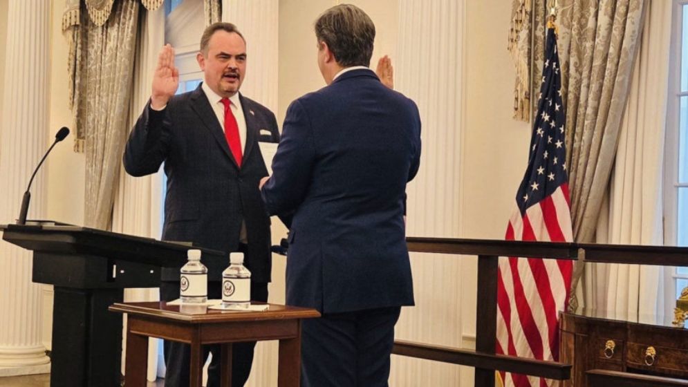 শুক্রবার ডেপুটি সেক্রেটারি অব স্টেট মাইকেল আর. ম্যাকফল ক্রিস্টেনসেনকে শপথবাক্য পাঠ করান।