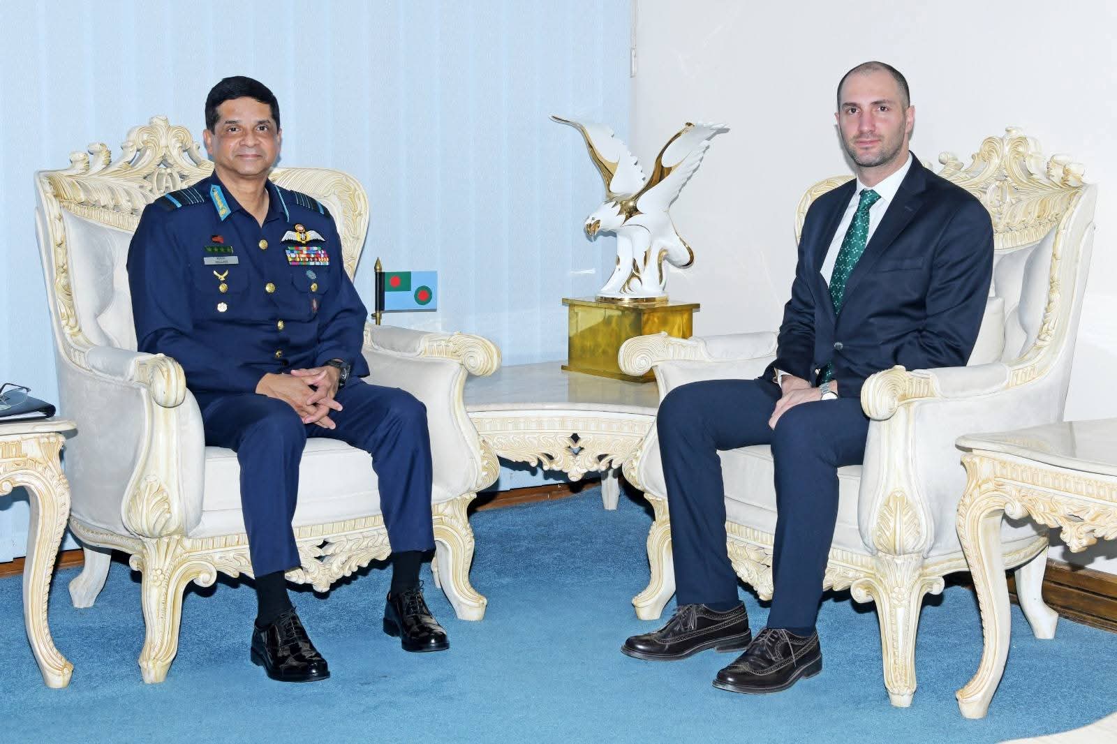 অদ্য ১৪ জানুয়ারি ২০২৬ (বুধবার), সম্মানিত বিমান বাহিনী প্রধান এয়ার চীফ মার্শাল হাসান মাহমুদ খাঁন, বিবিপি, ওএসপি, জিইউপি, এনএসডব্লিউসি, পিএসসি এর সাথে Mr. Bertan Kurt, ভাইস প্রেসিডেন্ট, কর্পোরেট মার্কেটিং এ্যান্ড কমিউনিকেশন অব তার্কিশ অ্যারোস্পেস বিমান বাহিনী সদর দপ্তরে সৌজন্য সাক্ষাৎ করেন।