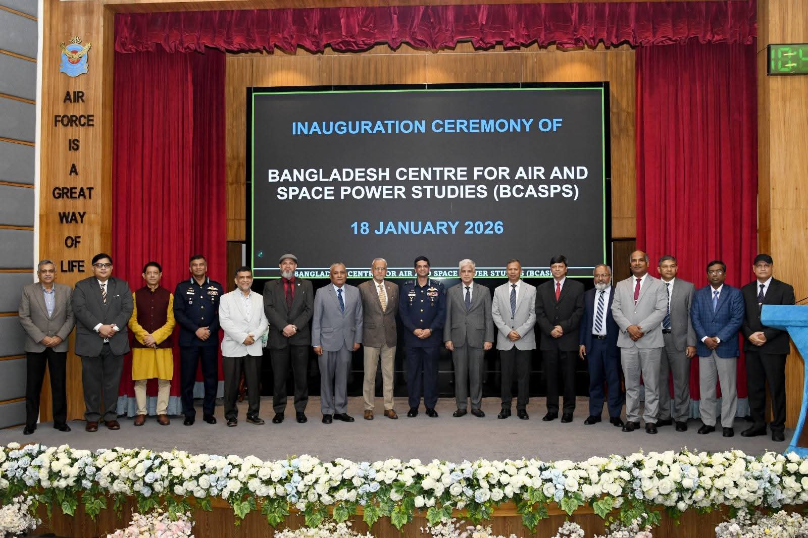অদ্য ১৮ জানুয়ারি ২০২৬, রবিবার বাংলাদেশ সেন্টার ফর এয়ার অ্যান্ড স্পেস পাওয়ার স্টাডিজ (BCASPS)- এর আনুষ্ঠানিক উদ্বোধন অনুষ্ঠিত হয়। সম্মানিত বিমান বাহিনী প্রধান এয়ার চীফ মার্শাল হাসান মাহমুদ খাঁন, বিবিপি, ওএসপি, জিইউপি, এনএসডব্লিউসি, পিএসসি প্রধান অতিথি হিসেবে উপস্থিত থেকে উক্ত অনুষ্ঠান ও BCASPS-এর ওয়েবসাইট www.bcasps.org উদ্বোধন করেন। অনুষ্ঠানে প্রধান অতিথি এয়ার অ্যান্ড স্পেস পাওয়ার বিষয়ক গবেষণায় নিবেদিত স্বাধীন থিঙ্ক ট্যাংক (Think Tank) হিসেবে BCASPS- এর যাত্রা শুরুর বিষয়ে দৃঢ় আস্থা ও আশাবাদ ব্যক্ত করেন। তিনি বলেন, কার্যকরভাবে আকাশসীমা নিয়ন্ত্রণ ও সুরক্ষা নিশ্চিত করা জাতীয় সার্বভৌমত্ব ও স্থিতিশীলতার মৌলিক ভিত্তি। এই পরিবর্তনশীল কৌশলগত পরিবেশে বাংলাদেশের সার্বভৌমত্ব, জাতীয় নিরাপত্তা এবং দীর্ঘমেয়াদি উন্নয়ন স্বার্থ সুরক্ষার জন্য বিমান ও মহাকাশ— উভয় ক্ষেত্র সম্পর্কেই একটি সমন্বিত ও সুস্পষ্ট ধারণা গড়ে তোলা অত্যাবশ্যক।