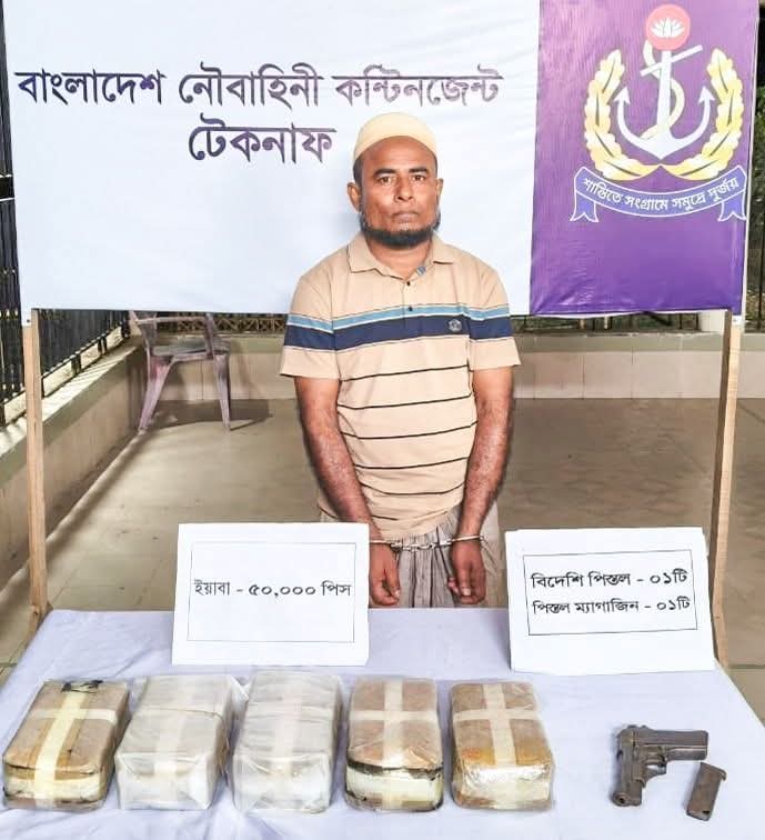 গোপন সংবাদের মাধ্যমে টেকনাফে মোতায়েনকৃত নৌবাহিনীর কন্টিনজেন্ট মাদক পাচারের তথ্য জানতে পারে। প্রাপ্ত তথ্যের ভিত্তিতে নৌবাহিনীর বিশেষায়িত আভিযানিক দল আলীখালী এলাকার জামাই বাজার সংলগ্ন এলাকায় কৌশলগতভাবে ওত পেতে থাকে। এসময় কুখ্যাত মাদক ব্যবসায়ী মোঃ রফিক ওরুফে বরমাইয়া রফিক সিএনজি যোগে উক্ত এলাকায় আগমন করলে তাকে আটক করা হয়। প্রাথমিকভাবে সিএনজিটি তল্লাশি করে কোনো মাদকদ্রব্য পাওয়া না – গেলেও জিজ্ঞাসাবাদে জানা যায়, মাদকের চালানটি তার দুইজন সহযোগীর মাধ্যমে চৌধুরীপাড়া ব্রিজ সংলগ্ন একটি মাটির স্তুপের নিচে পুঁতে রাখা হয়েছে। উক্ত তথ্যের ভিত্তিতে নৌবাহিনীর আভিযানিক দলটি তাৎক্ষণিক চৌধুরীপাড়া ব্রিজ সংলগ্ন এলাকায় তল্লাশি অভিযান পরিচালনা করে। তল্লাশিকালে মাটির স্তুপের নিচে পুতে রাখা একটি ব্যাগ হতে ৫০ হাজার পিস ইয়াবা এবং ০১ টি বিদেশি পিস্তল উদ্ধার করা হয়। অভিযান শেষে আটককৃত মাদক ব্যবসায়ীর বিরুদ্ধে আইনানুগ ব্যবস্থা গ্রহণের লক্ষ্যে উদ্ধারকৃত অস্ত্র ও মাদকসহ টেকনাফ থানায় হস্তান্তর করা হয়। থানা সূত্রে জানা যায়, আটককৃত মাদক কারবারির বিরূদ্ধে টেকনাফ থানায় মাদক পাচারের একাধিক অভিযোগ রয়েছে।
