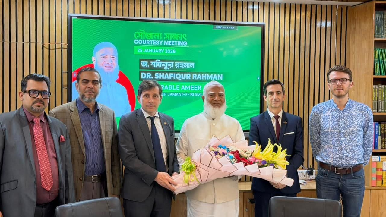আজ ২৫ জানুয়ারি (রবিবার) সন্ধ্যায় বাংলাদেশ জামায়াতে ইসলামীর কেন্দ্রীয় কার্যালয়ে সম্মানিত আমীরে জামায়াত ডা. শফিকুর রহমানের সঙ্গে ঢাকায় নিযুক্ত ফ্রান্সের রাষ্ট্রদূত মি. জ্যঁ-মার্ক সেরে-শার্লেট এক সৌজন্য সাক্ষাতে মিলিত হন। তাঁর সঙ্গে ছিলেন ডেপুটি রাষ্ট্রদূত মি. ফ্রেদেরিক ইনজা ও অর্থনৈতিক উপদেষ্টা মি. জুলিয়েন ডিউর।