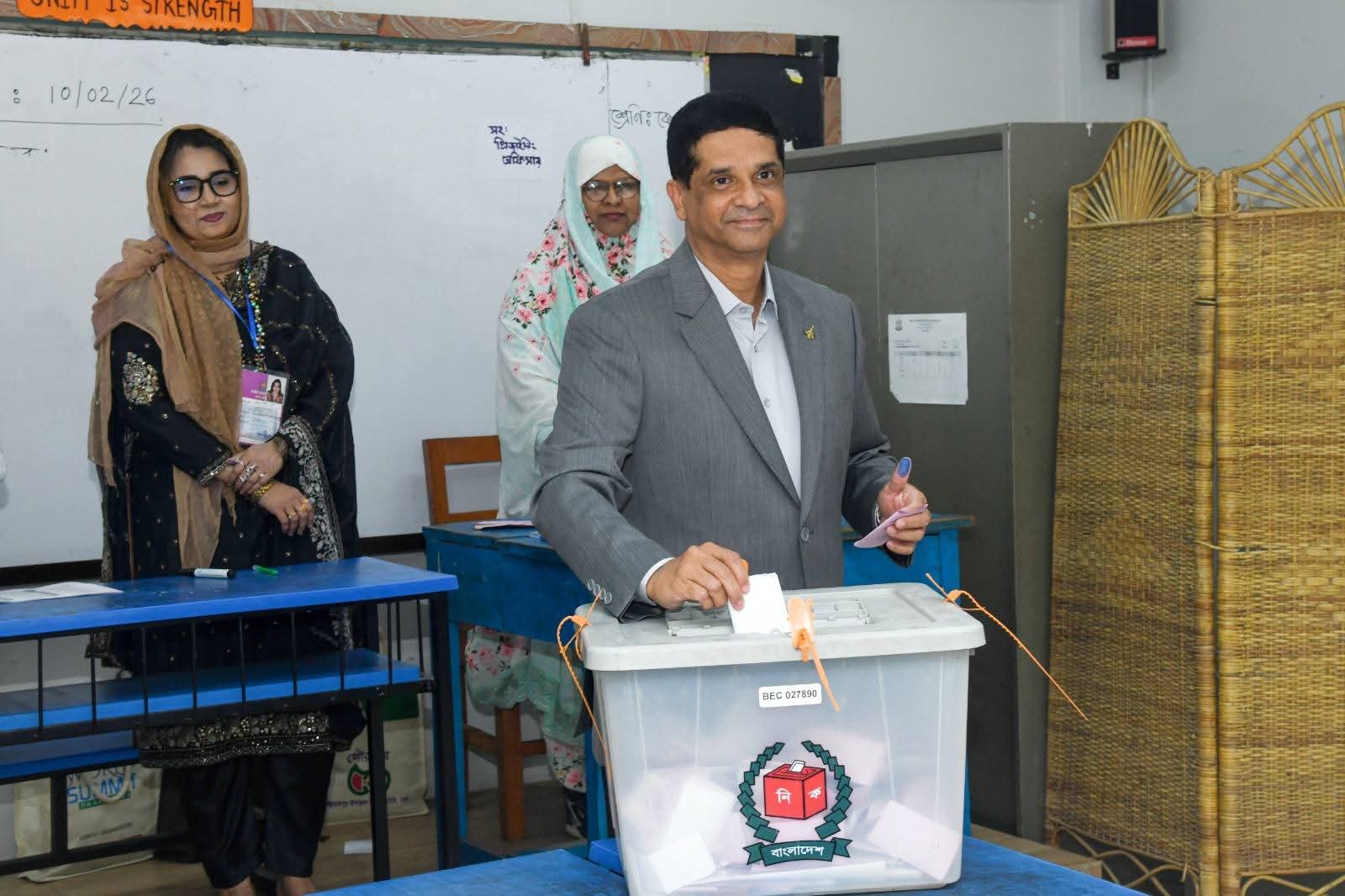 ত্রয়োদশ জাতীয় সংসদ নির্বাচন ও গণভোট-২০২৬ উপলক্ষ্যে অদ্য ১২ ফেব্রুয়ারি ২০২৬ (বৃহস্পতিবার) সম্মানিত বিমান বাহিনী প্রধান এয়ার চীফ মার্শাল হাসান মাহমুদ খাঁন, বিবিপি, ওএসপি, জিইউপি, এনএসডব্লিউসি, পিএসসি বিএএফ শাহীন কলেজ, ঢাকা ভোটকেন্দ্রে স্বশরীরে উপস্থিত হয়ে তাঁর মূল্যবান ভোট প্রদান করেন।