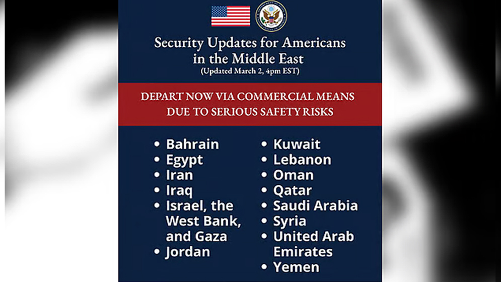 যুক্তরাষ্ট্রের পররাষ্ট্র দপ্তর মধ্যপ্রাচ্যের কয়েকটি দেশে অবস্থানরত মার্কিন নাগরিকদের দ্রুত সেখান থেকে সরে যাওয়ার আহ্বান জানিয়েছে।