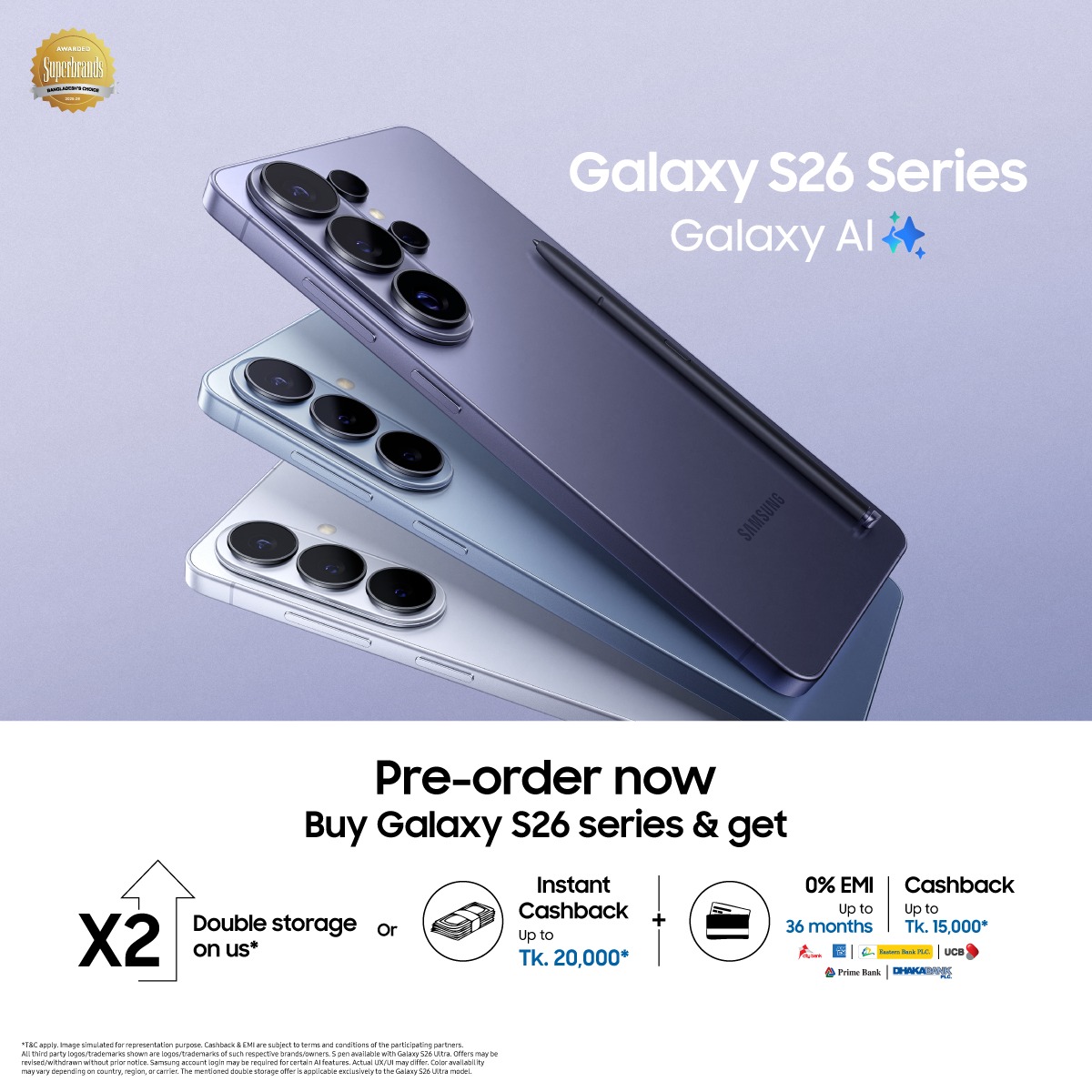 [ঢাকা, মার্চ ০৩, ২০২৬] দেশের বাজারে নিজেদের ফ্ল্যাগশিপ এস সিরিজের বহুল প্রতীক্ষিত সর্বশেষ স্মার্টফোন লাইনআপ গ্যালাক্সি এস২৬ সিরিজের প্রি-অর্ডার শুরু করেছে স্যামসাং। নতুন প্রজন্মের গ্যালাক্সি এআই–সমৃদ্ধ এই প্রিমিয়াম সিরিজটি গত ২৫ ফেব্রুয়ারি বৈশ্বিকভাবে উন্মোচন করা হয়। এরপরই দেশের বাজারে প্রি-অর্ডার কার্যক্রম শুরু করে স্যামসাং বাংলাদেশ।