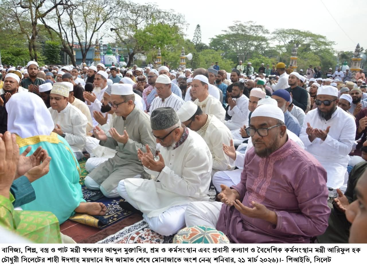 সিলেট, ০৭ চৈত্র (২১ মার্চ): সিলেটের ঐতিহ্যবাহী শাহী ঈদগাহ ময়দানে পবিত্র ঈদুল ফিতরের নামাজ আদায় করেছেন বাণিজ্য, শিল্প, বস্ত্র ও পাটমন্ত্রী খন্দকার আব্দুল মুক্তাদির এমপি এবং শ্রম ও কর্মসংস্থান ও প্রবাসীকল্যাণ ও বৈদেশিক কর্মসংস্থানমন্ত্রী আরিফুল হক চৌধুরী এমপি। নামাজ শেষে মন্ত্রীদ্বয় সর্বস্তরের মানুষের সঙ্গে ঈদের শুভেচ্ছা বিনিময় করেন।