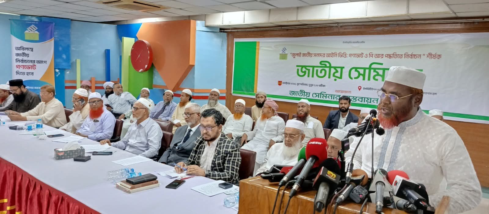 ‘জুলাই জাতীয় সনদের আইনি ভিত্তি: গণভোট ও পিআর পদ্ধতিতে নির্বাচন’ শীর্ষক জাতীয় সেমিনার বৃহস্পতিবার (১৬ অক্টোবর) বিকেলে অনুষ্ঠিত হয়েছে। বাংলাদেশ ইসলামিক ইউনিভার্সিটির সাবেক ভিসি প্রফেসর মো. কোরবান আলীর সভাপতিত্বে রাজধানীর ইনস্টিটিউশন অব ডিপ্লোমা ইঞ্জিনিয়ার্স মিলনায়তনে অনুষ্ঠিত সেমিনারে কী-নোট স্পিকার হিসেবে সেমিনারের বিষয়বস্তুর ওপর বক্তব্য উপস্থাপন করেন সুপ্রিম কোর্টের সিনিয়র আইনজীবী ব্যারিস্টার মুহাম্মদ বেলায়েত হোসেন। সেমিনারে বিভিন্ন রাজনৈতিক দলের জাতীয় নেতৃবৃন্দ, সাবেক সচিব, সাবেক ভিসি ও বিভিন্ন পেশাজীবী সংগঠনের নেতৃবৃন্দ বক্তব্য রাখেন। বক্তারা জুলাই জাতীয় সনদ অন্তর্ভুক্ত করে নভেম্বরের মধ্যেই গণভোট সম্পন্ন করার দাবি জানান।