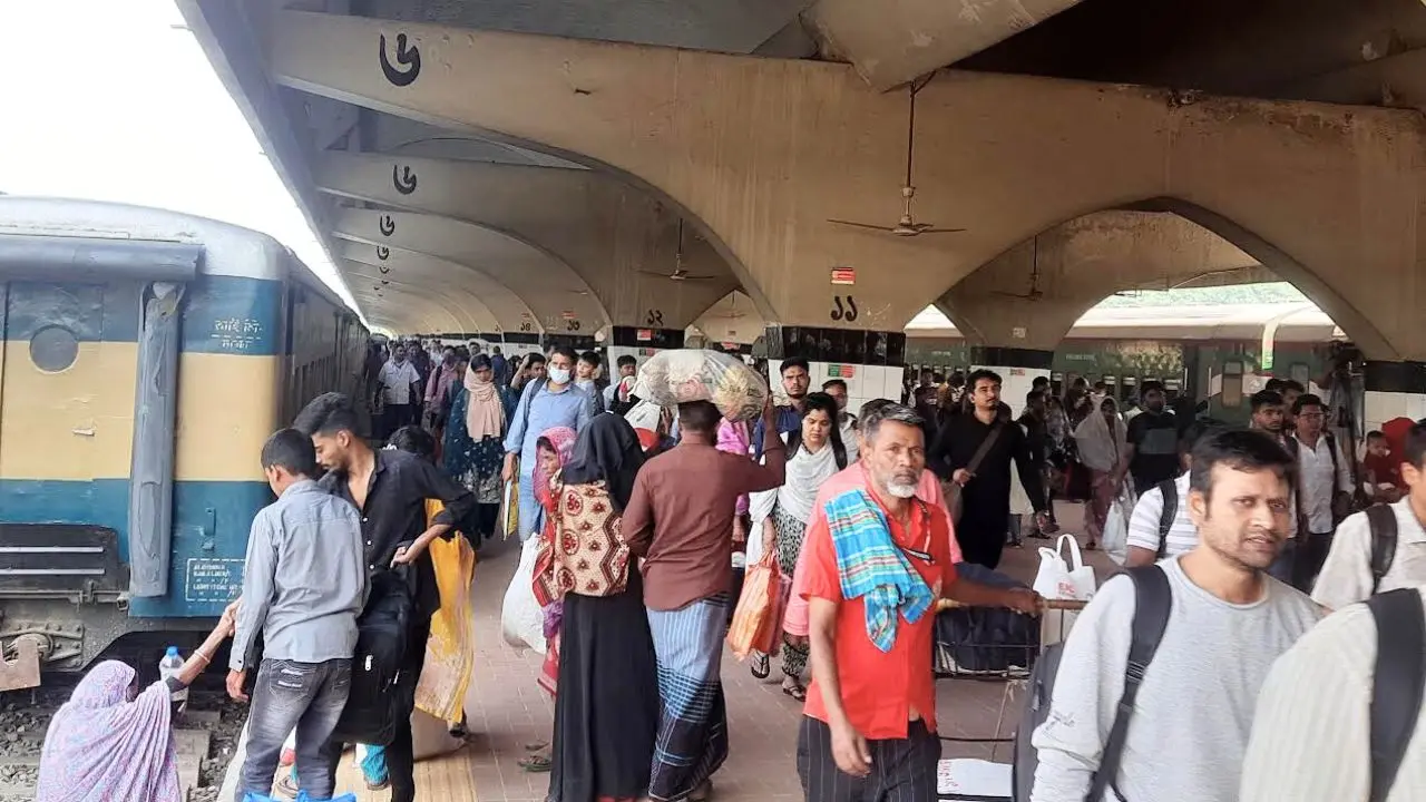 মঙ্গলবার (২৪ মার্চ) সকালে রাজধানীর কমলাপুর রেলওয়ে স্টেশন ঘুরে দেখা যায়, বিভিন্ন জেলা থেকে আগত ট্রেনগুলোতে মানুষের ভিড়। সড়ক, লঞ্চ ও ট্রেনে চড়ে দলে দলে মানুষ ব্যস্ত নগরীতে ফিরছেন। তবে এই ফেরার স্রোতের মধ্যেও অনেককে এখনো পরিবার-পরিজন নিয়ে গ্রামের বাড়িতে ঈদ উদযাপনে ছুটতে দেখা গেছে।