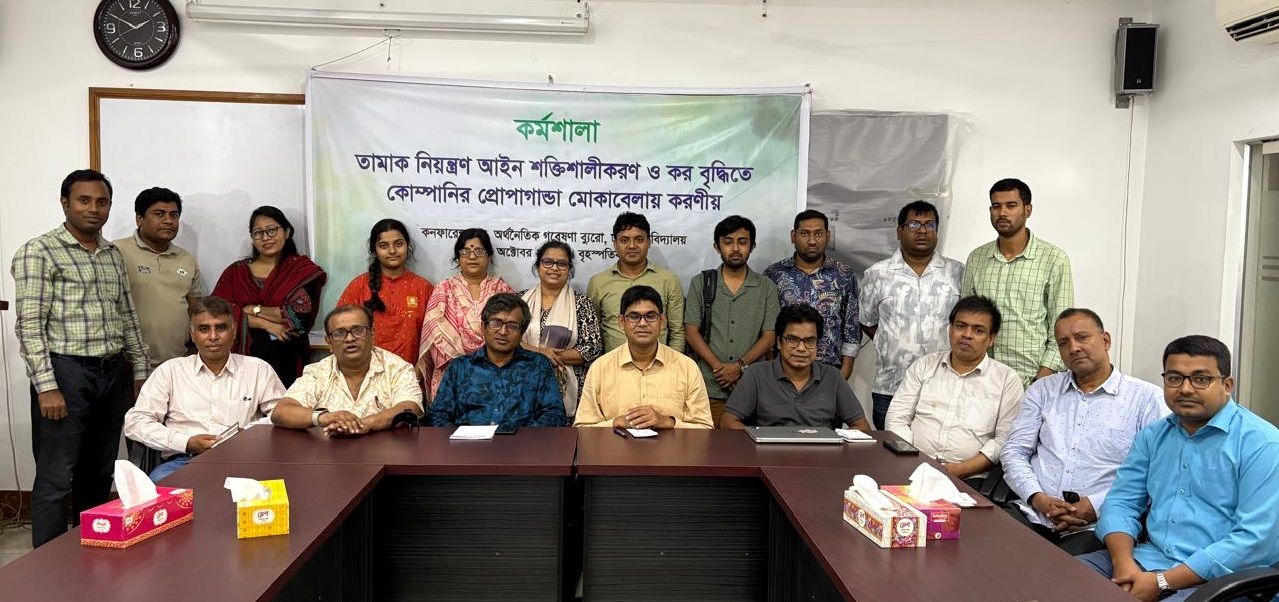 আজ বৃহস্পতিবার (২৩ অক্টোবর ২০২৫) সকাল ১১টায় ঢাকা বিশ্ববিদ্যালয়ের অর্থনৈতিক গবেষণা ব্যুরোর সম্মেলন কক্ষে “তামাক নিয়ন্ত্রণ আইন শক্তিশালীকরণ ও কর বৃদ্ধিতে কোম্পানির প্রোপাগান্ডা মোকাবেলায় করণীয়”শীর্ষক একটি কর্মশালায় বক্তারা এসব কথা বলেন। ঢাকা বিশ্ববিদ্যালয়ের অর্থনৈতিক গবেষণা ব্যুরো (বিইআর) ও বাংলাদেশ নেটওয়ার্ক ফর টোব্যাকো ট্যাক্স পলিসি (বিএনটিটিপি) যৌথভাবে এ কর্মশালার আয়োজন করে।