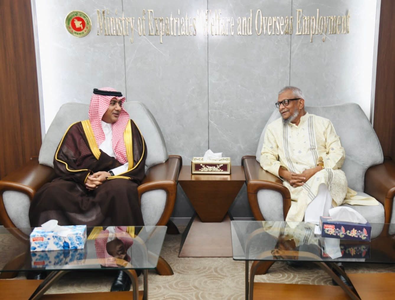 মন্ত্রী আরও বলেন, যাচাইকৃত ও দক্ষ কর্মীদের একটি ডিজিটাল ডাটাবেজ বা ‘কোয়ালিফাইড ট্যালেন্ট ব্যাংক’ তৈরি করা প্রয়োজন, যা নিয়োগ প্রক্রিয়াকে কয়েক সপ্তাহ থেকে মাত্র কয়েক দিনে নামিয়ে আনবে। জনশক্তি নিয়োগে যেকোনো ধরনের অবৈধ লেনদেন, অনিয়ম বা কর্মী হয়রানির বিরুদ্ধে বর্তমান সরকারের ‘জিরো টলারেন্স’ নীতির কথা তিনি রাষ্ট্রদূতকে স্পষ্টভাবে অবহিত করেন। তাছাড়া সৌদিতে দক্ষ শ্রমিক প্রেরণের পাশাপাশি হোয়াইট কলার চাকুরিতে কর্মী নেয়ার জন্য রাষ্ট্রদূতকে আহ্বান জানান।