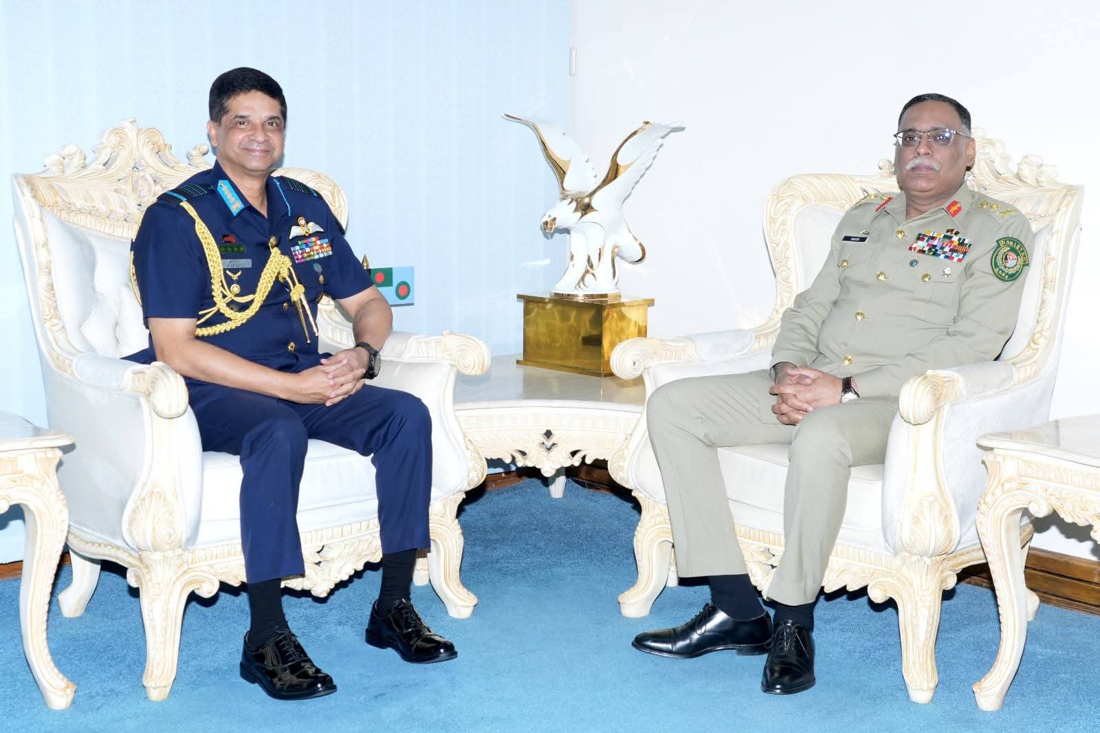 অদ্য ২৬ অক্টোবর ২০২৫ (রবিবার) তারিখে, পাকিস্তানের জয়েন্ট চীফস অব স্টাফ কমিটির চেয়ারম্যান জেনারেল সাহির শামশাদ মির্জা, এনআই (এম) এর নেতৃত্বে একটি প্রতিনিধিদল বিমান বাহিনী সদর দপ্তরে বাংলাদেশ বিমান বাহিনী প্রধান এয়ার চীফ মার্শাল হাসান মাহমুদ খাঁন, বিবিপি, ওএসপি, জিইউপি, এনএসডব্লিউসি, পিএসসি এর সাথে সৌজন্য সাক্ষাৎ করে। সাক্ষাৎকালে, পারস্পরিক কুশল বিনিময়ের পাশাপাশি তাঁরা দুই দেশের মধ্যে সামরিক সহযোগিতা জোরদারের উপর গুরুত্বারোপ করেন।