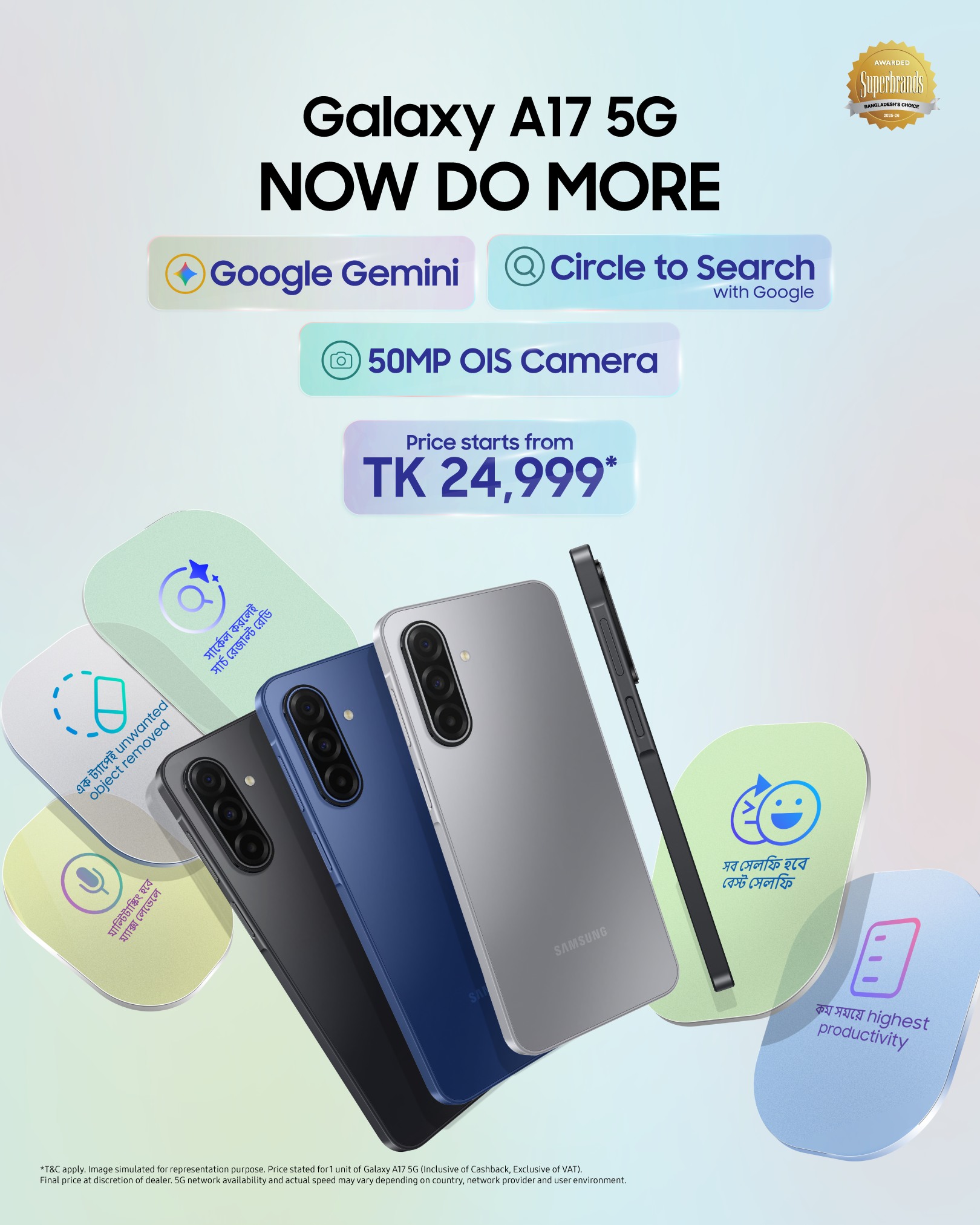 [ঢাকা, ২৫ অক্টোবর, ২০২৫] স্যামসাং দেশের বাজারে উন্মোচন করেছে তাদের সর্বশেষ উদ্ভাবন ‘গ্যালাক্সি এ১৭ ৫জি। স্মার্টফোনটিতে ব্যবহারকারীরা ব্যবহার করতে পারবেন জেমেনাই এআই ফিচার ‘সার্কেল টু সার্চ।’ ‘অসাম ইন্টেলিজেন্স ফর এভরিওয়ান’ এ লক্ষ্যের ধারাবাহিকতায় স্যামসাং বাজারে নিয়ে এসেছে সাশ্রয়ী ৫জি এআই স্মার্টফোন – গ্যালাক্সি এ১৭ ৫জি।