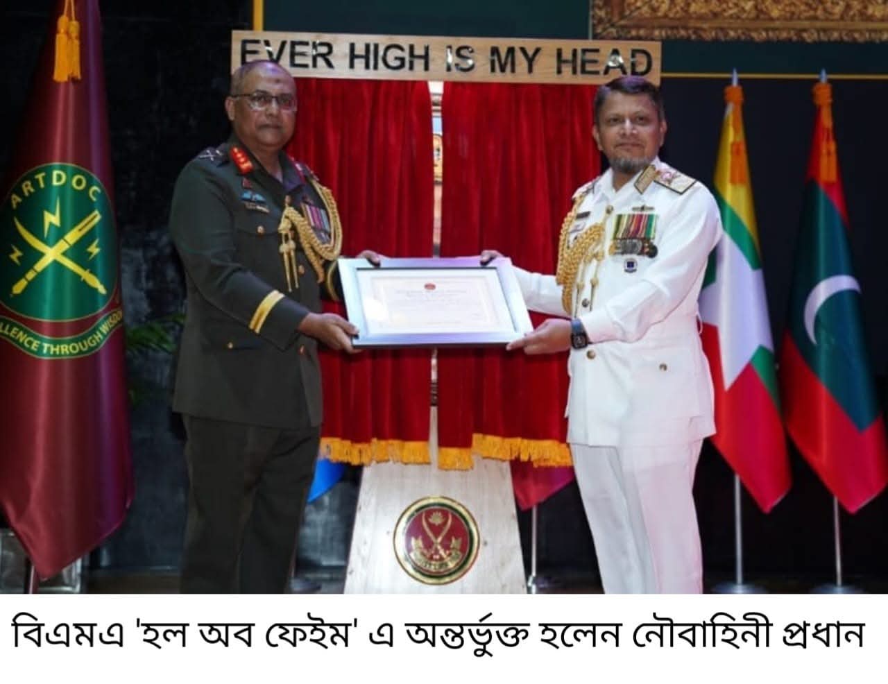 চট্টগ্রামের ভাটিয়ারীতে অবস্থিত বাংলাদেশ মিলিটারি একাডেমি (বিএমএ)-তে নৌবাহিনী ও বিমান বাহিনী প্রধান হিসেবে গৌরবমণ্ডিত ‘হল অব ফেইম’-এ অন্তর্ভুক্ত হন। ‘হল অব ফেইম’ হলো একটি ঐতিহ্যগত সর্বোচ্চ সম্মাননা, যা কোন নির্দিষ্ট ক্ষেত্রে অসাধারণ অবদানের স্বীকৃতি স্বরূপ কোন ব্যক্তিকে এ সম্মানে ভূষিত করা হয়। বিএমএ’র ‘হল অব ফেইম’-এ সেনাবাহিনী প্রধানগণের পাশাপাশি বাহিনী প্রধান হিসেবে প্রথম বারের মতো বর্তমান নৌ ও বিমান বাহিনী প্রধানগণ এ বিরল সম্মানে ভূষিত হলেন। অনুষ্ঠানে নৌবাহিনী ও বিমান বাহিনী প্রধানগণের সহধর্মিণীগণও উপস্থিত ছিলেন।